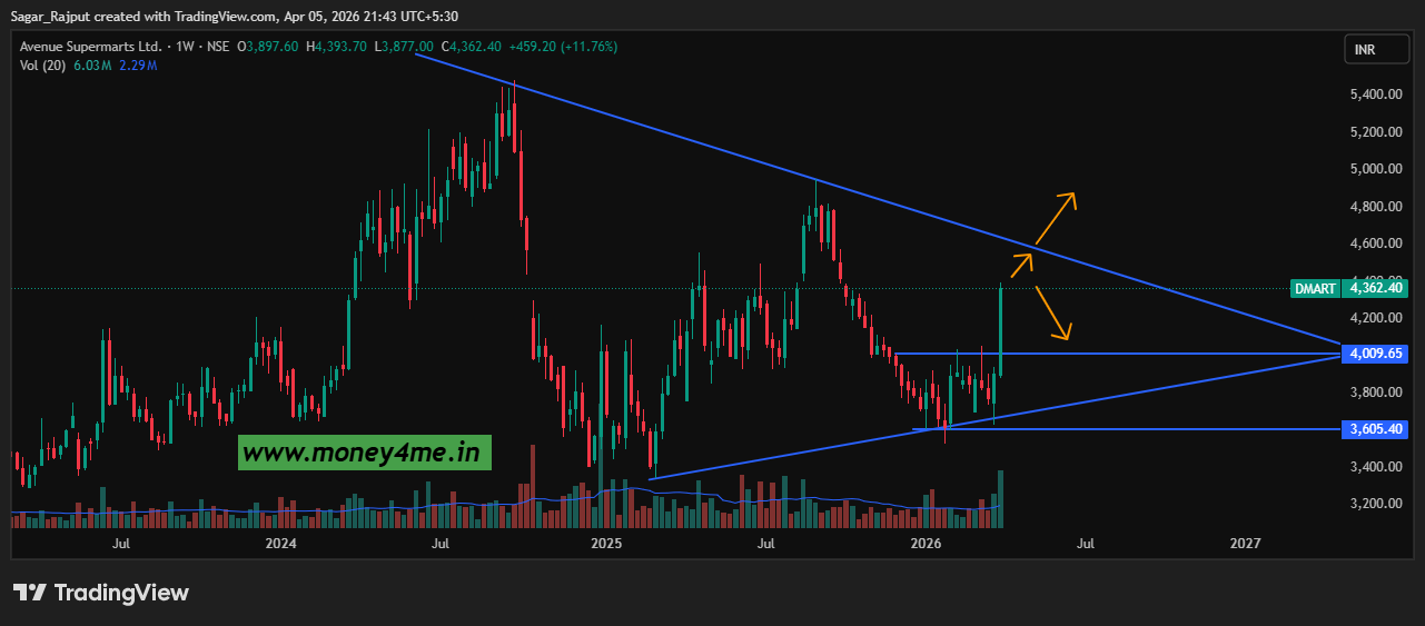 Avenue Supermarts Ltd (DMart) is currently showing a strong technical structure on the weekly chart. The stock is forming a symmetrical triangle pattern, indicating a phase of consolidation before a potential big move.